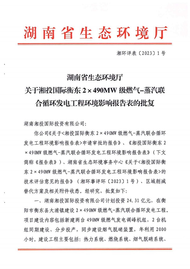 2023年3月9日,由省咨詢公司編制的《湘投國際衡東2×490MW級燃氣-蒸汽聯(lián)合循環(huán)發(fā)電工程環(huán)境影響報告表》順利獲得湖南省生態(tài)環(huán)境廳批復(湘環(huán)評表[2023]1號),為項目后續(xù)依法合規(guī)開工建設奠定了堅實基礎(chǔ)。