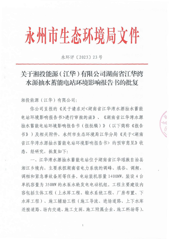 近日,我司環(huán)境保護(hù)咨詢事業(yè)部負(fù)責(zé)撰寫的《湖南省江華灣水源抽水蓄能電站環(huán)境影響報(bào)告書》,順利通過了永州市生態(tài)環(huán)境局的評(píng)審并取得批復(fù)(永環(huán)評(píng)〔2023〕23號(hào))。