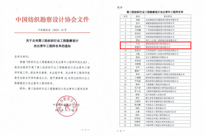 近日,中國紡織勘察設(shè)計協(xié)會正式公布了“第三批紡織行業(yè)工程勘察設(shè)計杰出青年工程師”評選結(jié)果,湘咨集團(tuán)下屬省輕紡院申龍、蔡德昌2名專家榮獲“第三批紡織行業(yè)勘察設(shè)計杰出青年工程師”榮譽(yù)稱號。