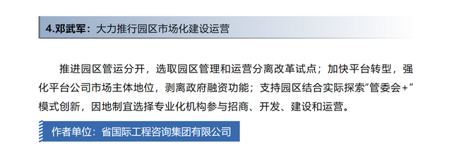 《大力推行園區(qū)市場化建設(shè)運(yùn)營金點(diǎn)子》中建議,推進(jìn)園區(qū)管運(yùn)分開,選取園區(qū)管理和運(yùn)營分離改革試點(diǎn);加快平臺轉(zhuǎn)型,強(qiáng)化平臺公司市場主體地位,剝離政府融資功能;支持園區(qū)結(jié)合實際探索“管委會+”模式創(chuàng)新,因地制宜選擇專業(yè)化機(jī)構(gòu)參與招商、開發(fā)、建設(shè)和運(yùn)營。