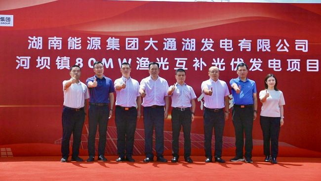該項目由湖南能源集團所屬大通湖發(fā)電公司投資建設(shè),項目交流側(cè)容量80MW,結(jié)合當?shù)靥厥獾乩憝h(huán)境,采用“水下養(yǎng)殖、水上發(fā)電”的漁光互補發(fā)電模式,使水域資源復(fù)合利用率提升至200%,預(yù)計年發(fā)電量可達1.08億度,節(jié)約標煤 3.41萬t/年,減排二氧化碳10.3萬t/年。項目2025年3月29日開工建設(shè),2025年5月29日實現(xiàn)全容量并網(wǎng)發(fā)電,工期由7個月縮短至2個月,預(yù)計增收2000萬元,彰顯了“湖南能源速度”。