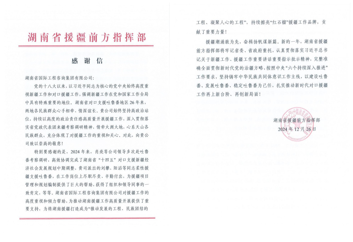 近日,湖南省援疆前方指揮部發(fā)來感謝信,對湘咨集團(tuán)及副總經(jīng)理肖亮、工作人員劉攀、陽滔等同志在援疆工作中作出的貢獻(xiàn)表示感謝。 近年來,湘咨集團(tuán)積極響應(yīng)黨中央關(guān)于援疆······